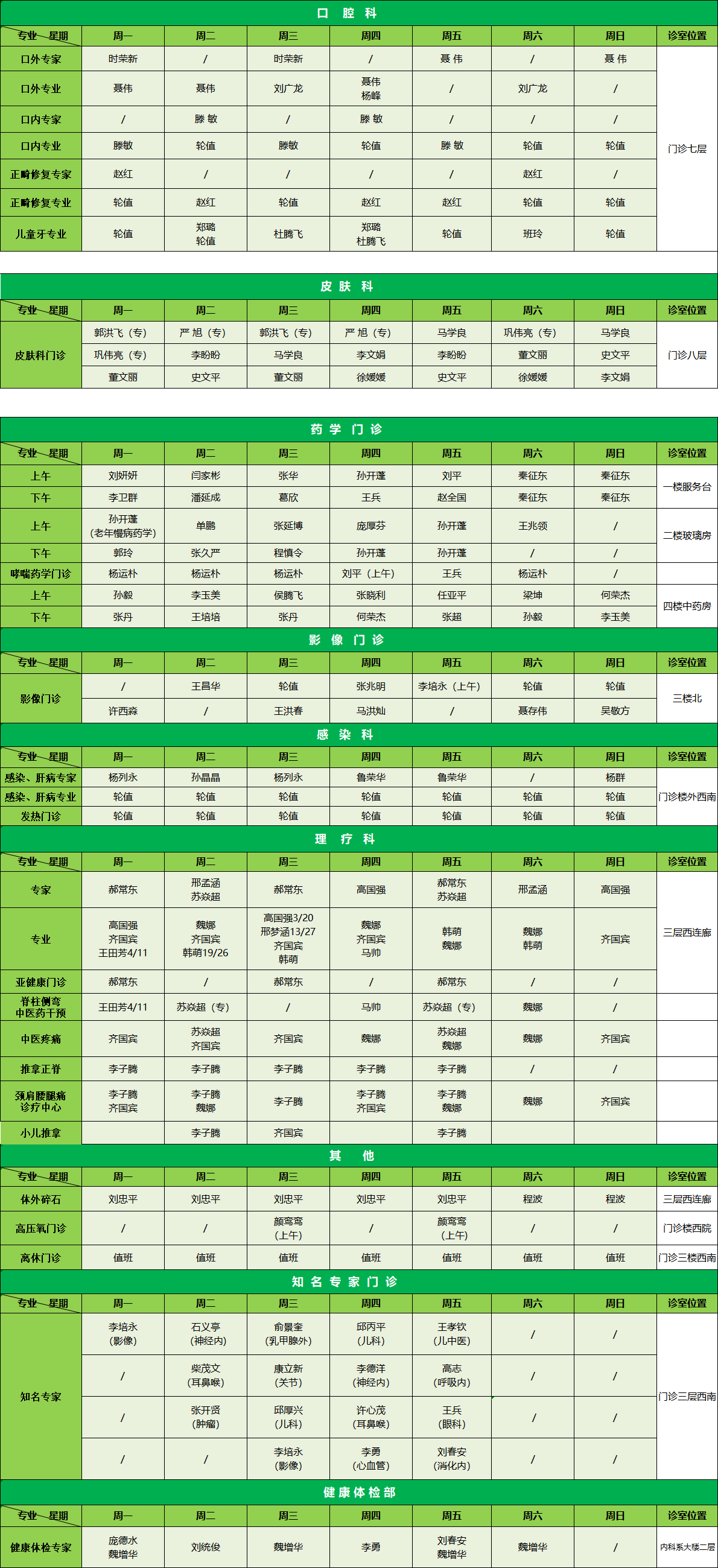 為了提供優(yōu)質(zhì)的醫(yī)療服務(wù),我們?yōu)槟l(fā)布最新的門診醫(yī)生坐診信息,便于您根據(jù)自身情況,選擇合適的醫(yī)生、合適的時(shí)間就診,希望能為您的就診帶來(lái)便利。