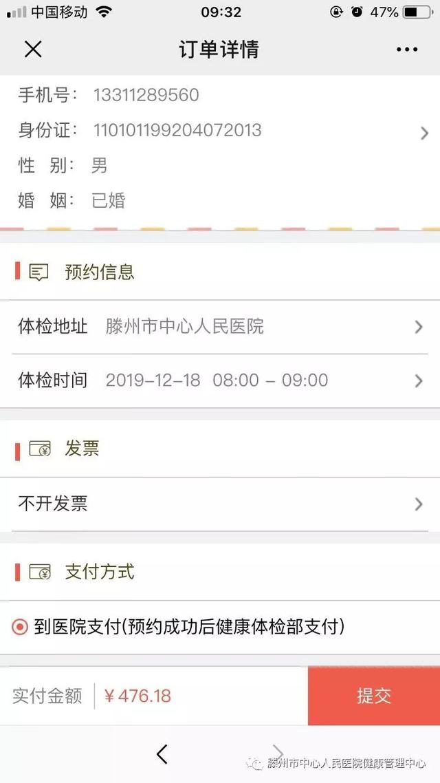05添加體檢人,選擇體檢地址和時間后點擊“提交”