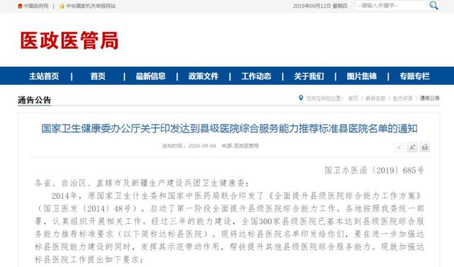 近日,國(guó)家衛(wèi)生健康委辦公廳發(fā)布《關(guān)于印發(fā)達(dá)到縣級(jí)醫(yī)院綜合服務(wù)能力推薦標(biāo)準(zhǔn)縣醫(yī)院名單的通知》,并公布全國(guó)達(dá)到縣級(jí)醫(yī)院綜合服務(wù)能力推薦標(biāo)準(zhǔn)縣醫(yī)院名單,共有來(lái)自全國(guó)24個(gè)省市的300家縣醫(yī)院榮列其中。其中,山東共有60家縣級(jí)醫(yī)院入選,榮膺縣級(jí)醫(yī)院達(dá)標(biāo)數(shù)量之冠。縣醫(yī)院達(dá)標(biāo)數(shù)量前十省份依次為:山東、江蘇、河南、浙江、湖北、河北、四川、福建、廣東、湖南。