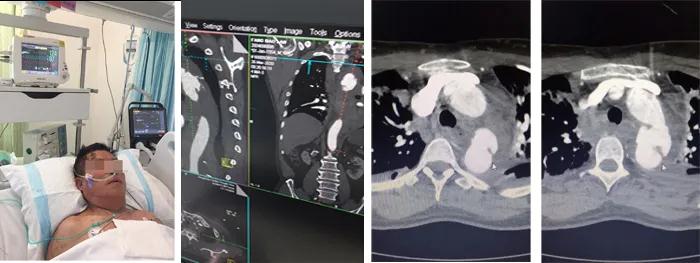 入院后,患者呼吸微弱,血壓僅65/40mmHg,血常規(guī)示:血紅蛋白由130下降至49g/L。主動脈CTA確診患者為主動脈夾層破裂,主動脈內(nèi)膜撕裂形成假性動脈瘤,胸腔和縱膈出現(xiàn)大量積血。柴召強醫(yī)師考慮患者病情患者危重,休克狀態(tài),隨時有死亡可能。向醫(yī)務部周永勤主任匯報,并向患者家屬講明病情,決定急診行主動脈腔內(nèi)覆膜支架植入腔內(nèi)修復術(shù)。