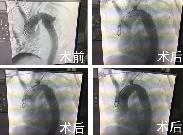 在CCU顏景朋主任、麻醉科陶宏主任的指導下,從股總動脈穿刺插入導管至升主動脈。造影顯示降主動脈左鎖骨下動脈開口遠端約1.8cm,外側(cè)有一破口約1.0cm寬,破口周圍假性動脈瘤形成,通過導入胸主動脈帶膜支架精確定位到左鎖骨下動脈后緣,然后釋放,再次造影,顯示破口封堵成功,手術(shù)順利結(jié)束。