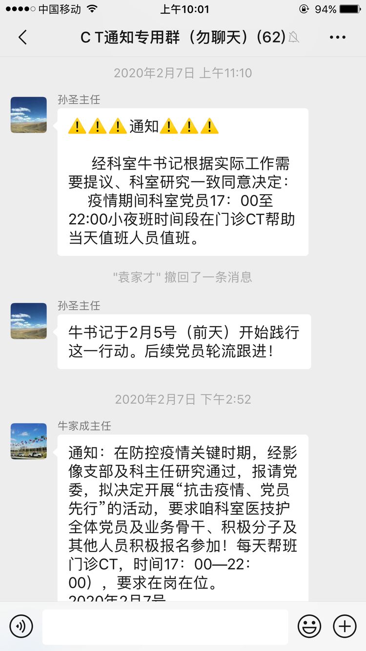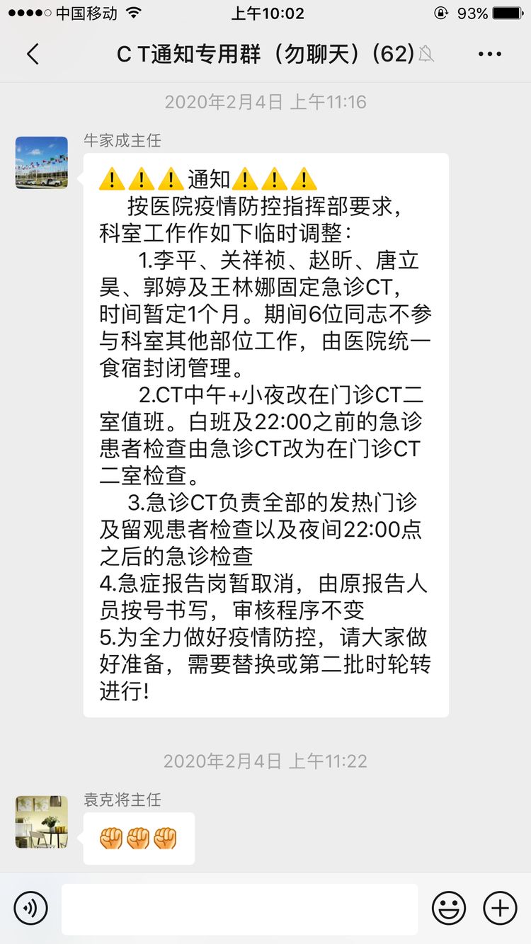 按照醫(yī)院防控指揮部要求,發(fā)熱門診需要配備專用X拍片機(jī)和專用CT檢查室,要求對(duì)所有人員進(jìn)行密閉管理。影像中心主任牛家成接通知后,第一時(shí)間在科室微信群內(nèi)下達(dá)緊急通知,并提出“抗擊疫情、黨員先行”的要求。為此,全體黨員及廣大群眾踴躍報(bào)名、積極參戰(zhàn),短短半個(gè)小時(shí)內(nèi)成立了由3名放射技師、4名CT醫(yī)師及2名登記人員組成的抗擊疫情第一梯隊(duì)。當(dāng)天,他們就按照工作要求到位到崗,臨時(shí)建立了發(fā)熱門診專用拍片室;優(yōu)化流程,把急診CT設(shè)為新冠肺炎患者檢查專用CT,及時(shí)擔(dān)負(fù)起發(fā)熱門診或疑似新冠肺炎病人的篩查工作。