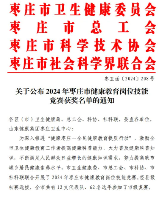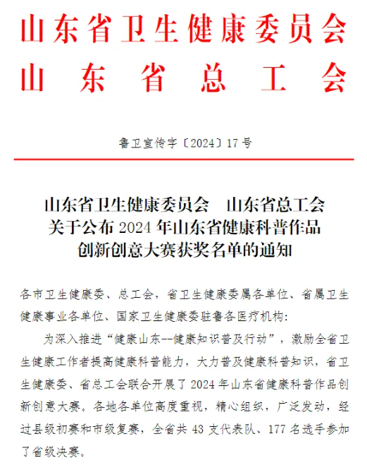 我院共318名醫(yī)務(wù)人員參賽,榮獲滕州市級一等獎20人、二等獎35人、三等獎52人、優(yōu)秀獎89人。其中,6人通過滕州市級健康教育和艾滋病防治技能競賽選拔,參加棗莊市及山東省競賽。足踝外科朱天文和婦科劉建華在棗莊市健康教育崗位技能競賽分獲一等獎和二等獎,并代表棗莊市參加山東省健康科普作品創(chuàng)新創(chuàng)意大賽,榮獲三等獎和優(yōu)秀獎。
