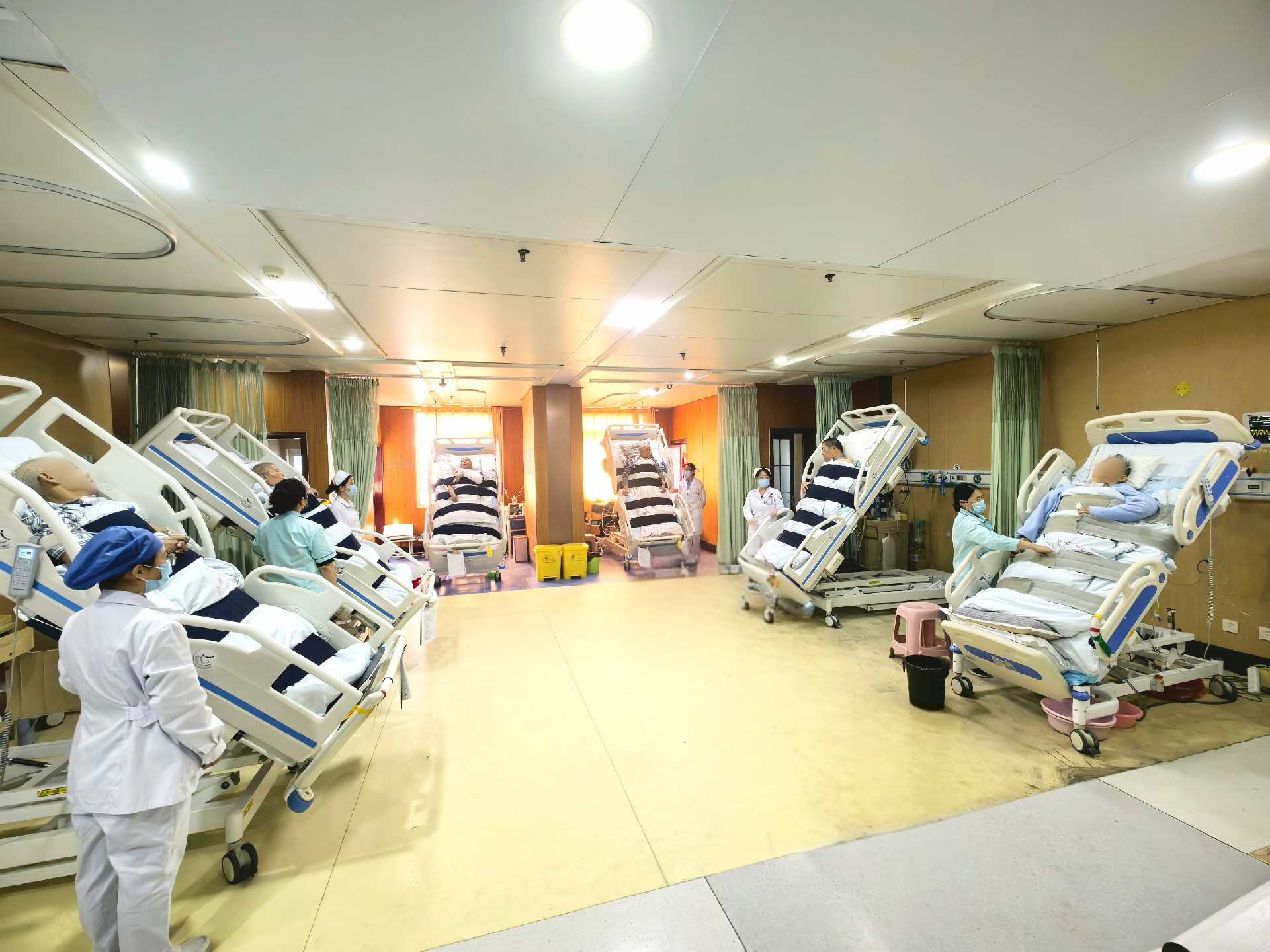 高依賴病房設置在保健樓七樓,現(xiàn)配置可站立電動病床8張,配備心電監(jiān)護、中心供氧、吸痰等急救設備。主要收治從重癥監(jiān)護室轉出的嚴重顱腦損傷后意識障礙、肢體運動功能障礙、氣管切開、吞咽障礙、生活需要高度依賴的重癥康復患者。
