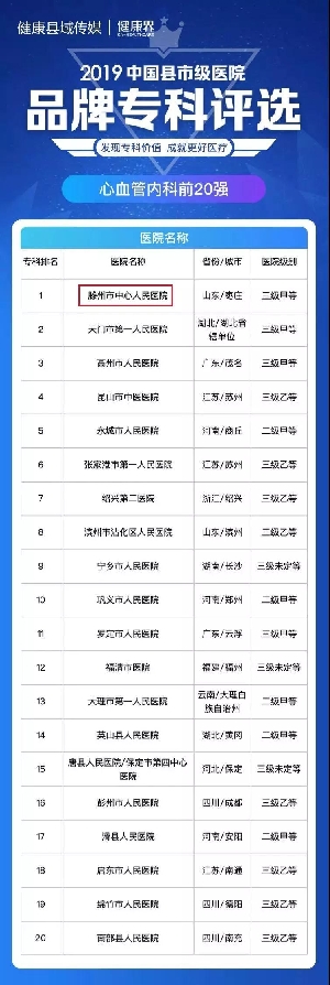 五個專科全國第一!滕州市中心人民醫(yī)院在2019中國縣市級醫(yī)院品牌···