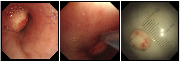 患者左主支氣管遠(yuǎn)端見結(jié)節(jié)狀白色腫物,表面上有少許表淺血管顯露,基底較寬,堵塞管腔約70%,予以高頻電套扎切除,少許出血,給與局部噴灑腎上腺素溶液止血,標(biāo)本送病理。2月16日病理結(jié)果示:肺錯構(gòu)瘤?;颊哂?月16日出院,醫(yī)護(hù)人員就復(fù)診問題給予其詳細(xì)的指導(dǎo)。