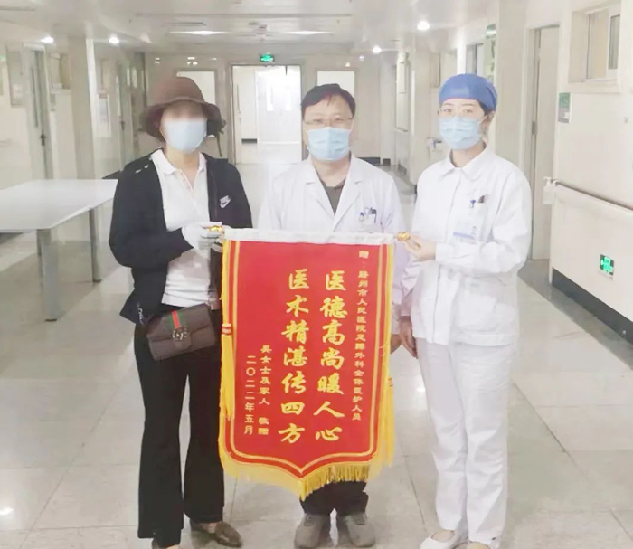 5月25日,足踝外科同一病房?jī)晌怀鲈夯颊哧愊壬岸壬募覍偻瑫r(shí)送來(lái)錦旗,表達(dá)了對(duì)潘維亮主任、段修芳副主任及全體醫(yī)護(hù)的人員的感激之情,尤其對(duì)李琳醫(yī)生及王瑩護(hù)士提出特別表?yè)P(yáng)。