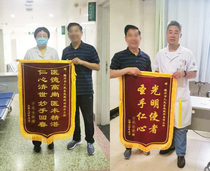 近日,眼科門診,一位七歲女童在父母的陪伴下,將一面寫有“醫(yī)德高尚暖人心,溫暖患者如家人”的錦旗送到王皓月主任和王雪蓮護(hù)士手中,以表達(dá)對她們精湛醫(yī)術(shù)和貼心服務(wù)的深深感激。
