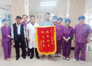 5月13日,患者周先生家屬將一面“醫(yī)技精湛挽垂危恩同再造謝萬(wàn)年”的錦旗送給EICU全體醫(yī)務(wù)人員,以表達(dá)對(duì)全體醫(yī)務(wù)人員的感謝和認(rèn)可。周先生家屬激動(dòng)地說(shuō):“太感謝你們了,給了他第二次生命!”患者,男,55歲,因突發(fā)憋喘40分鐘以“急性心力衰竭、心肌病”于5月2日收入EICU。患者入科時(shí)突發(fā)心臟驟停,當(dāng)班醫(yī)生錢玉軍、帶班護(hù)