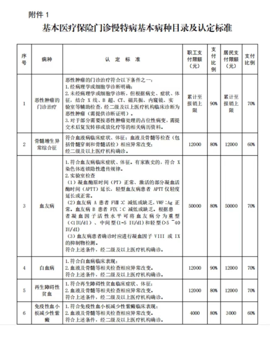 2.支付比例。參保職工惡性腫瘤的門診治療、白血病、組織或器官移植(抗排異治療)、尿毒癥透析治療等病種支付比例為90%,其余病種支付比例為80%;參保居民惡性腫瘤的門診治療、白血病、組織或器官移植(抗排異治療)、血友病等病種支付比例為70%,其余病種支付比例為60%。