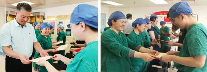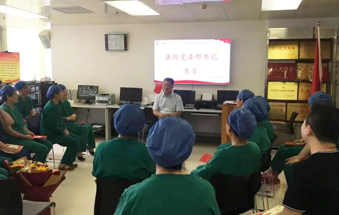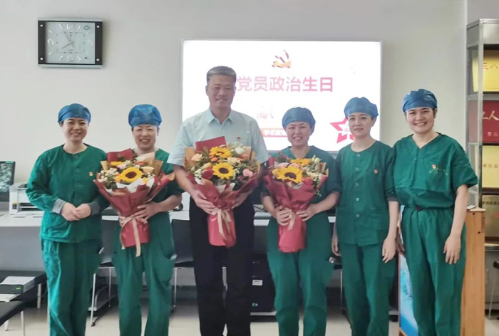 支部班子成員代表組織為黨齡大于15年的黨員獻花,并向他們表達了滿滿的祝福與敬意。杜延榮和李萍兩位同志作表態(tài)發(fā)言,表示一定會秉承“共產黨人的初心和使命”,不斷在手術室崗位上奉獻自己的力量!