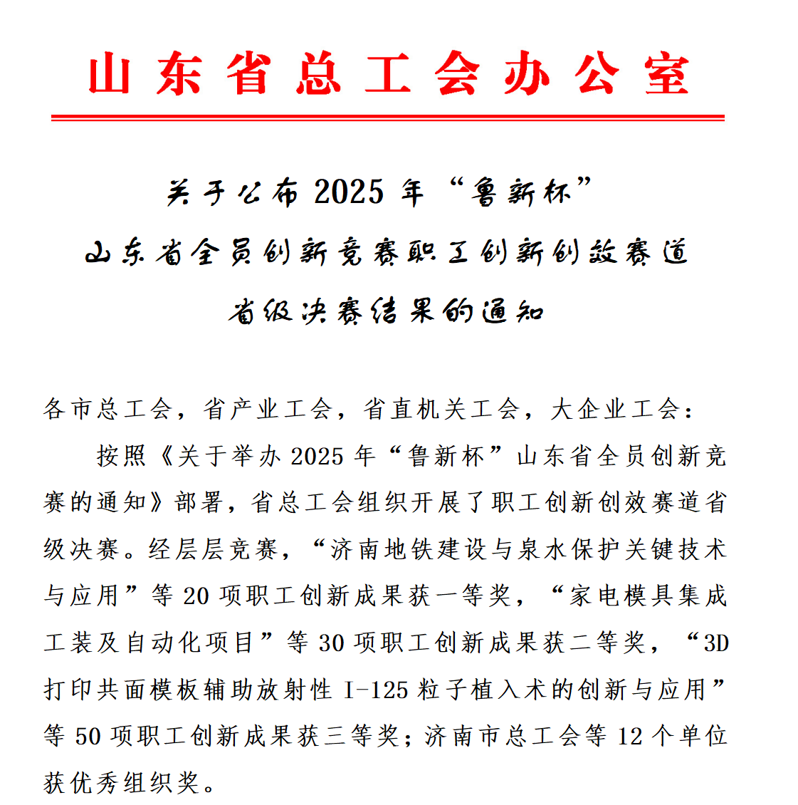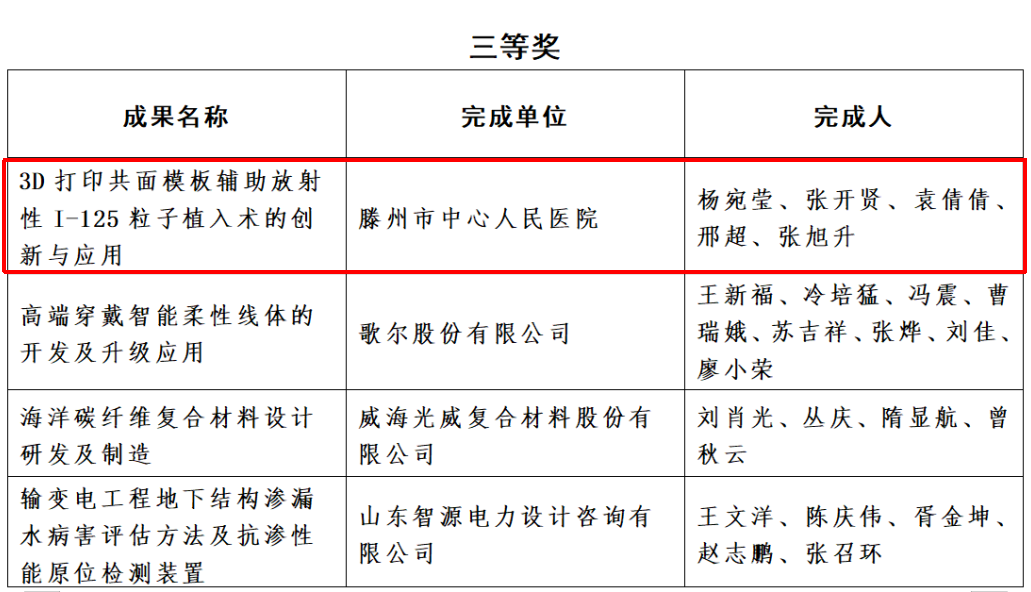 近日,山東省總工會(huì)公布2025年“魯新杯”山東省全員創(chuàng)新競(jìng)賽職工創(chuàng)新創(chuàng)效賽道省級(jí)決賽獲獎(jiǎng)名單。我院楊宛瑩團(tuán)隊(duì)創(chuàng)新成果《3D打印共面模板輔助放射性I-125粒子植入術(shù)的創(chuàng)新與應(yīng)用》歷經(jīng)推薦、初評(píng)及省級(jí)現(xiàn)場(chǎng)答辯等環(huán)節(jié),最終榮獲省級(jí)決賽三等獎(jiǎng)。