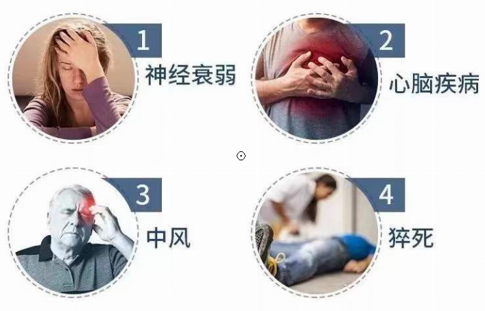 如今研究已經(jīng)證實(shí),如果長期的睡眠問題得不到解決,可導(dǎo)致高血壓、2型糖尿病、冠心病、心律失常特別是以慢-快心律失常為主、腦卒中、肺源性心臟病、神經(jīng)衰弱等,還會(huì)伴隨進(jìn)行性體重增加。