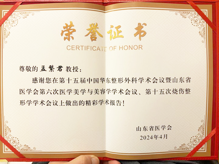 近日,第十五屆中國(guó)華東整形外科學(xué)術(shù)會(huì)議暨山東省醫(yī)學(xué)會(huì)第六次醫(yī)學(xué)美學(xué)與美容學(xué)學(xué)術(shù)會(huì)議、第十五次燒傷整形學(xué)學(xué)術(shù)會(huì)議在濟(jì)南舉行。我院整形美容科主任孟繁君受邀參加,并當(dāng)選為山東省醫(yī)學(xué)會(huì)醫(yī)學(xué)美學(xué)與美容分會(huì)委員,同時(shí)作了專題學(xué)術(shù)演講發(fā)言。