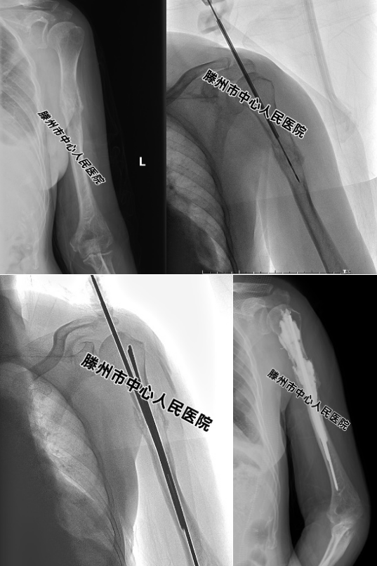 患者,女,62歲,因“咳嗽伴右上肢疼痛1個(gè)月”,在本院診斷為“肺腺癌并右肱骨轉(zhuǎn)移”。先進(jìn)行放療,效果不佳,右上肢疼痛難忍,不能活動(dòng),CT、MRI及拍片檢查發(fā)現(xiàn)右側(cè)肱骨溶骨性轉(zhuǎn)移,骨皮質(zhì)破壞明顯,隨時(shí)都有發(fā)生病理性骨折的風(fēng)險(xiǎn)。
